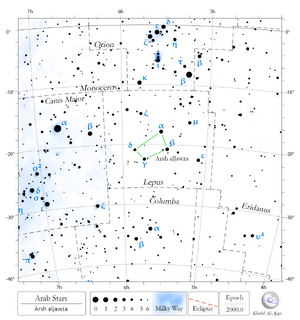 Arsh al-Jauzah (δ Lep : 3,8) / أرش Introduit à la fin du XXe siècle, ce nom est cArš al-Ğawzā’, « le Repose-pied d’Elgeuze », qui correspond au groupe αβγδ Lep (voir aussi  α Lep). Ar. cArš al-Ğawzā’, al-Ṣūfī p/ αβγδ Lep > ‘Arsh AlGjauza’, Hyde, noté Arsh p/ α Lep, Allen. Arsh al-Jauzah, Rhoads. NB : cette étoile est en turc Ricl-ül-erneb-üş-şimâlî , soit « le Pied septentrional du Lièvre », tiré d’un traité en langue turque c/ Pultar.