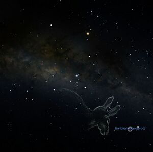 Bandaarr is Kamilaroi/Euahlayi for Kangaroo, and this kangaroo is located under the belly of the Emu in the Milky Way, looking away from the Emu. Bandaarr is either a grey or red kangaroo, depending on the culture, and has significance in ceremony.[1] The belly of the Emu is formed by dark clouds in the Milky Way, and "under" it, where the legs of the emu would be, is the area of the constellations mentioned above.