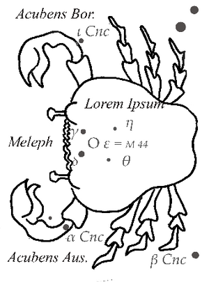 One of the 88 IAU constellations. The name "Crab" for this area is attested since the Babylonian compendium MUL.APIN, but there are alternative names such as "northern and southern donkey" for the two bright stars next to the star cluster M44, Praesepe for the star cluster, "The Seat of [sky god] Anu" for the box-shaped pattern of stars around the star cluster (where "the seat" of any Babylonian god is ambiguously his throne and his temple).