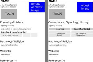The lemma pages follow a strict schema, as the ASE is meant to contain information on astronomical data, philology and the history of transfer and transformation of words and images, namely change of vocubulary (etymology) and change of the position/ star/ asterism to which they are applied.