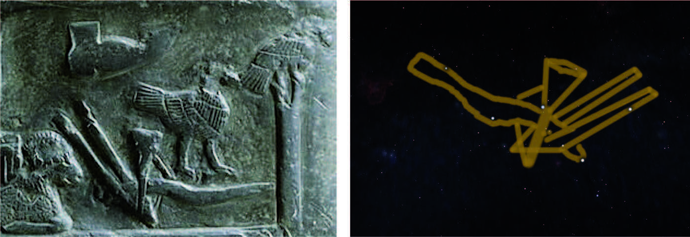 Cassiopeia (map from Stellarium software: right) and a drawing of a seeder plough as depicted on the kudurru Sb 22 (Louvre; detail: left). Fig.1 in Hoffmann, S.M. and Krebernik, M. (2023): What do deities tell us about the celestial positioning system, in: R. Rollinger, I. Madreiter, M. Lang, C. Pappi (eds.). The Intellectual Heritage of the Ancient Near East, Papers held at the 64th Rencontre Assyriologique International and 12th Melammu Symposium July 16-20 2018, Innsbruck. Austrian Academy of Sciences Press, 539-579