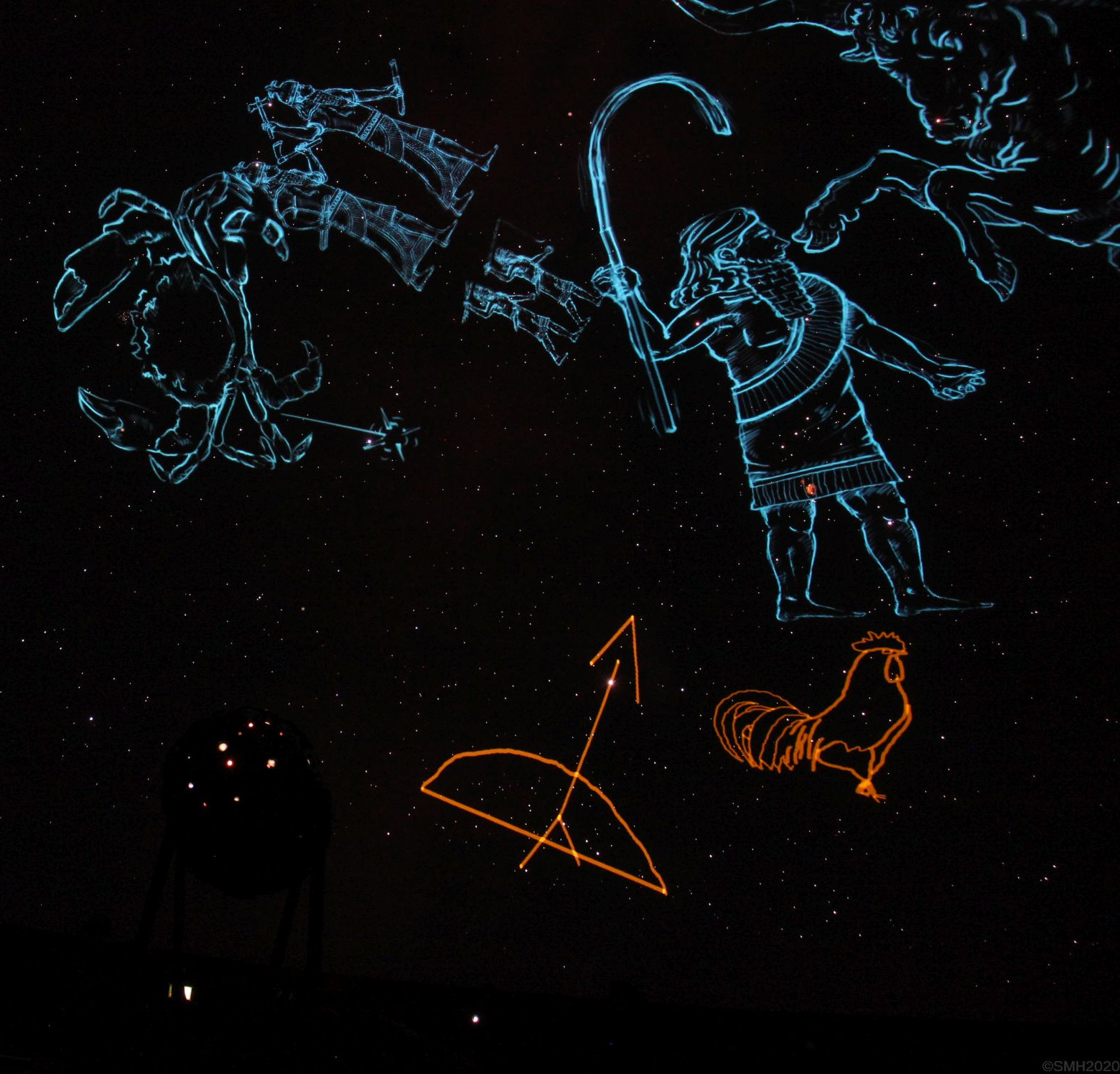 Orion in Old Babylonian drawing style (CC BY R. Perdok, LWL Planetarium Münster) as a shepherd, mapped to the planetarium sky (photo by SMH in Planetarium Jena).