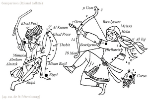 By adopting the Greek sky, Arab astronomers of the classical period took up the Greek figure by borrowing its Syriac name, Gambara, ‘the Giant’, which gives al-Ğabbar. But this new name could not displace, in the Arab imagination, the well-established figure of al-Ğawzā’ ‘Elgeuze’, which literally means ‘the Median’, because it stands ‘in the middle’ of the sky (see infra, Fig. 68a and b)