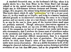 "Why it was so favored in nomenclature is not known, for with us it is noticeable only from its exquisite beauty in the telescope, whence it is fast monopolizing the name Pulcherrima, given to it by the elder Struve."