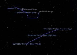 Santai (三台) is a Chinese super-constellation consisting of the constellations Shangtai (上台) (Upper Steps), Zhongtai (中台) (Middle Steps), and Xiatai (下台) (Lower Steps).