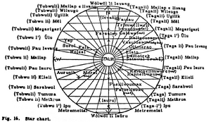 The ethnographer Burrows produced a star chart showing the rising (tagali) and setting (tubuwuli) positions of various Ifalik navigation stars <see figure, after Burrows and Spiro 1953:[2] fig. 16> with the aid of a native informant, "Tom", as follows: