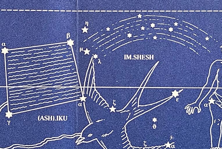 Babylonian constellation of the Rainbow next to the IKU-constellation. This way, IM-SHESH would culminate together with the Swallow and not rise together with it, so it contradicts at least one of the texts. | Babylonian constellation of the Rainbow next to the IKU-constellation (Papke 1993). This way, IM-SHESH would culminate together with the Swallow and not rise together with it, so it contradicts at least one of the texts. | ||
