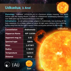 Udkadua is a modern star name adopted by the International Astronomical Union in the IAU-Catalog of Star Names (IAU-CSN). Its origin is Sumerian ([[UD.KA.DU8.A]]). It is the name of HIP 116584 (λ And, HR 8961) in constellation And. | |||