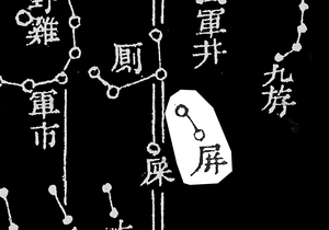Ping (屏), Ce ( | Ping (屏, Screen), Ce (廁, or Tiance 天廁, Celestial Toilet), and Shi (屎, or Tianshi 天矢, Celestial Excrement) are a group of semantically related constellations. Ping is the barrier in front of the Celestial Toilet. These three constellations were used for divining epidemics and diseases across the land. | ||