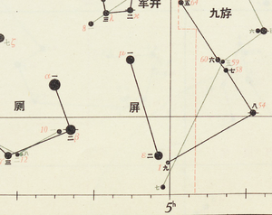 Píng (屏, Screen) is a Chinese constellation. Its meaning is a screen in front of a toilet. | |||