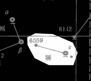 - ↑ 4.0 4.1 B.-S. Yang杨伯顺, Zhongguo Chuantong Hengxing Guance Jingdu ji Xingguan Yanbian Yanjiu 中国传统恒星观测精度及星官演变研究 (A Research on the Accuracy of Chinese Traditional Star Observation and the Evolution of Constellations), PhD thesis, (Hefei: University of Science and Technology of China, 2023). 261.