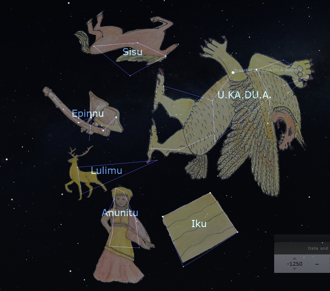 UD.KA.DU8.A and its entourage in Stellarium: The Horse, The Stag, The Pig to its left and right (paintings by Jessica Gullberg 2021). The identification of The Pig is uncertain; it could also be in the area of Delphinus, but as the two stars at the end of Sagitta form a pair like a pig's nose, this orientation was chosen.