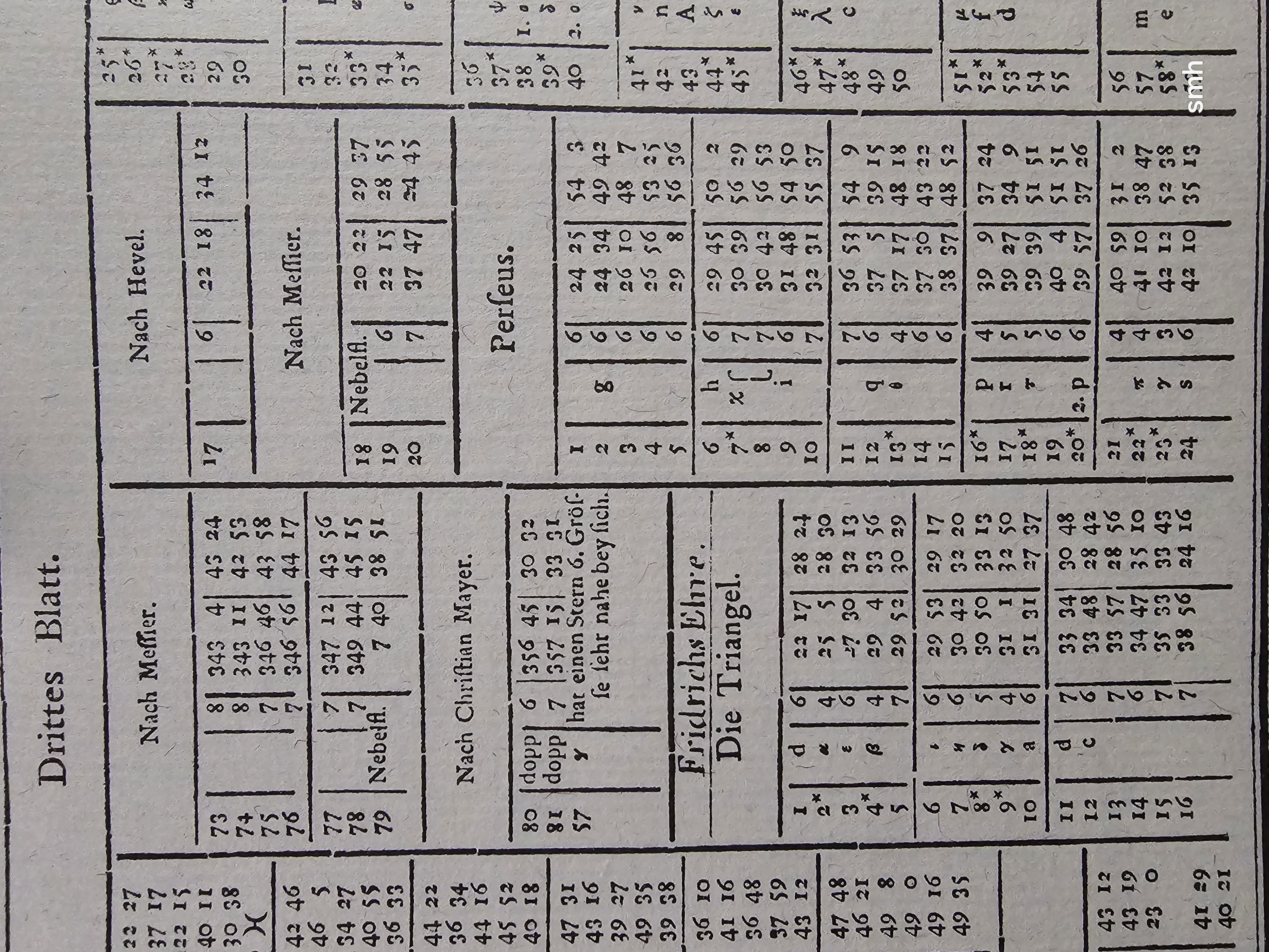 Bode (1782) star catalogue. Originally, in the first edition, "Friedrichsehre" was not mentioned, but in a later edition, it was added to the headline "Triangel" (Triangulum). | Bode (1782) star catalogue. Originally, in the first edition, "Friedrichsehre" was not mentioned, but in a later edition, it was added to the headline "Triangel" (Triangulum) which is the wrong place, as Triangulum is southeast of Andromeda and his new constellation northwest of her. | ||