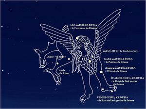 Example | * Le nom de U4.KA.DUḪ.A, « le Démon tempête à la Gueule béante », est attesté dans les Tables calendaires dites « astrolabes » datées de la fin du 1er millénaire av. J.-C. o il correspond à α Cyg.