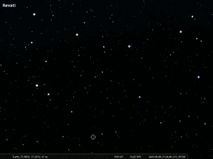 [[File:27 Revati stellarium2.gif|thumb|Revati's shape in temples matches a characteristic star pattern north of its determinative star. Here mapped to Stellarium (SMH for WGSN 2025).]] | [[File:27 Revati stellarium2.gif|thumb|Revati's shape in temples matches a characteristic star pattern north of its determinative star. Here mapped to Stellarium (SMH for WGSN 2025).]] | ||