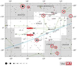 Apāṃvatsa (अपऻऺवत्स) is an Indian star name attested throughout the last millennium. The only indication of the position is Apamvatsa is 5° to the north of Citrā (चित्रा) (Spica) in Virgo. No information on magnitudes is preserved.[1] Shylaja and Pai (2019) identify 74 Vir (SIMBAD, VSX), a red giant of roughly one solar mass and apparent brightness of V~4.69 mag. Red giants vary in brightness due to pulsation, but the VSX gives only an interval of 0.07 mag in V.