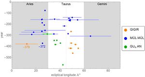 I. Источники. Лексич. тексты. (1) Шумерские одноязычные списки звезд: mul gišgigir [MSL XI, 108:398], ˹mulgigir˺ [MSL XI, 134, col. ix 7], mul gišgigir [MSL XI, 143, col. x 18]. (2) Серия Urra XXII: [nar-kab-tu] [Cavigneaux 1981, 105, 79.B.1/5 iv 13], mul gišgigir = dEn-[me-šar2]-ra [Bloch–Horowitz 2015, 107:290ʹ]. (3) Ea I 48a: gi-girLAGAB´BAD ša2 mulLAGAB´BAD dEn-me-šar2-ra «Колесница (созвездия) “Колесница Энмешарры”» [MSL XIV, 197; CAD N/1, 353b]. См. также sh16ŠU.GI. «Энки и устройство мира». См. a48AŠ.GAN2. «Молитвы ночным богам». Новоассирийская молитва: в списке астральных богов mul gišGIGIR [Oppenheim 1959, 283:16]. MUL.APIN. Астрологические предсказания, см. u02U.RI.RI [MA, 110]. «Письма» Сообщение о наблюдении Юпитера: šap-la mul gišGIGIR ina KASKAL šu-ut dEN.LIL2 iz-za-az «ниже Колесницы на пути (звезд) Энлиля он стоит» [SAA 10, 363 r. 9–10, 11; LAS 2 289–291]. «Дневники наблюдений». (1) Созвездие использовалось для фиксации положений планет, например: AN ina GIGIR «Марс в Колеснице» [AD I, No.-380 rev. 1′], MUL2.BABBAR ina GIGIR «Юпитер в Колеснице» [AD I, No.-372 D obv. 3′], GU4.UD ar2 GIGIR ŠU2, AN ina G[IGIR SU2…] «Последнее появление Меркурия позади Колесницы, [последнее появление] Марса в Ко[леснице…]» [AD I, No.-366 Col. i 19′], MUL2.BABBAR ina GIGIR ŠU2 «Последнее появление Юпитера в Колеснице» [AD I, No.-324 A obv.12], GENNA ina GIGIR SU2 «Последнее появление Сатурна в Колеснице» [AD I, No.-266 A obv. 6′] и др. (2) В созвездии две «нормальных звезды» (см. ниже). См. также: mul gišGIGIR = dDili-pat2 [SpTU I, 27 r. 24; 28:9ʹ]. II. Божество. Энмешарра, см. e11dEN.ME.ŠAR2.RA. III. Символ. Колесница c телом Энмешарры (?), см. e11dEN.ME.ŠAR2.RA. IV. Отождествление. = β + ζ Tauri [Gössmann 1950, 89, I]; = τὸ ἅρμα «Колесница», упоминается в «Варварской сфере» греческого астролога Тевкра («Вавилонянина») (I в.н.э.?) [ibid.; Boll 1903, 108ff.; Bezold–Kopff–Boll 1913, 15:62]. = Hyades [Weidner 1957–59, 73a]. = β + ζ Tauri [LAS 2, 291]. = ζ, ο+ Persei, возможно, с некоторыми звездами на севере Тельца [BPO 2, 11–12]. = северная часть Тельца [Hunger-Pingree 1999, 271]. V. Части созвездия и отдельные звезды. (1) ŠUR GIGIR ša2 SI «Северная вожжа Колесницы» (β Tauri). (2) ŠUR GIGIR ša2 ULU2 «Южная вожжа Колесницы» (ζ Tauri). Звезды (1) и (2) входили в число «нормальных звезд», см. m39MUL2.ŠID.MEŠ. VI. Астрология. (1) Луна “едет” на Колеснице; см. sh16ŠU.GI, VI 12. В астрологических текстах созвездие упоминается чаще как dEn-me-šar2-ra (см. e11). |