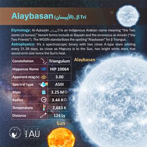 The name "Alaybasan" was adopted by Beta Tri on 7 Nov. 2025. Hyphens are allowed in star names, but are depreciated due to common practice for centuries (see Aldebaran, Altair...).