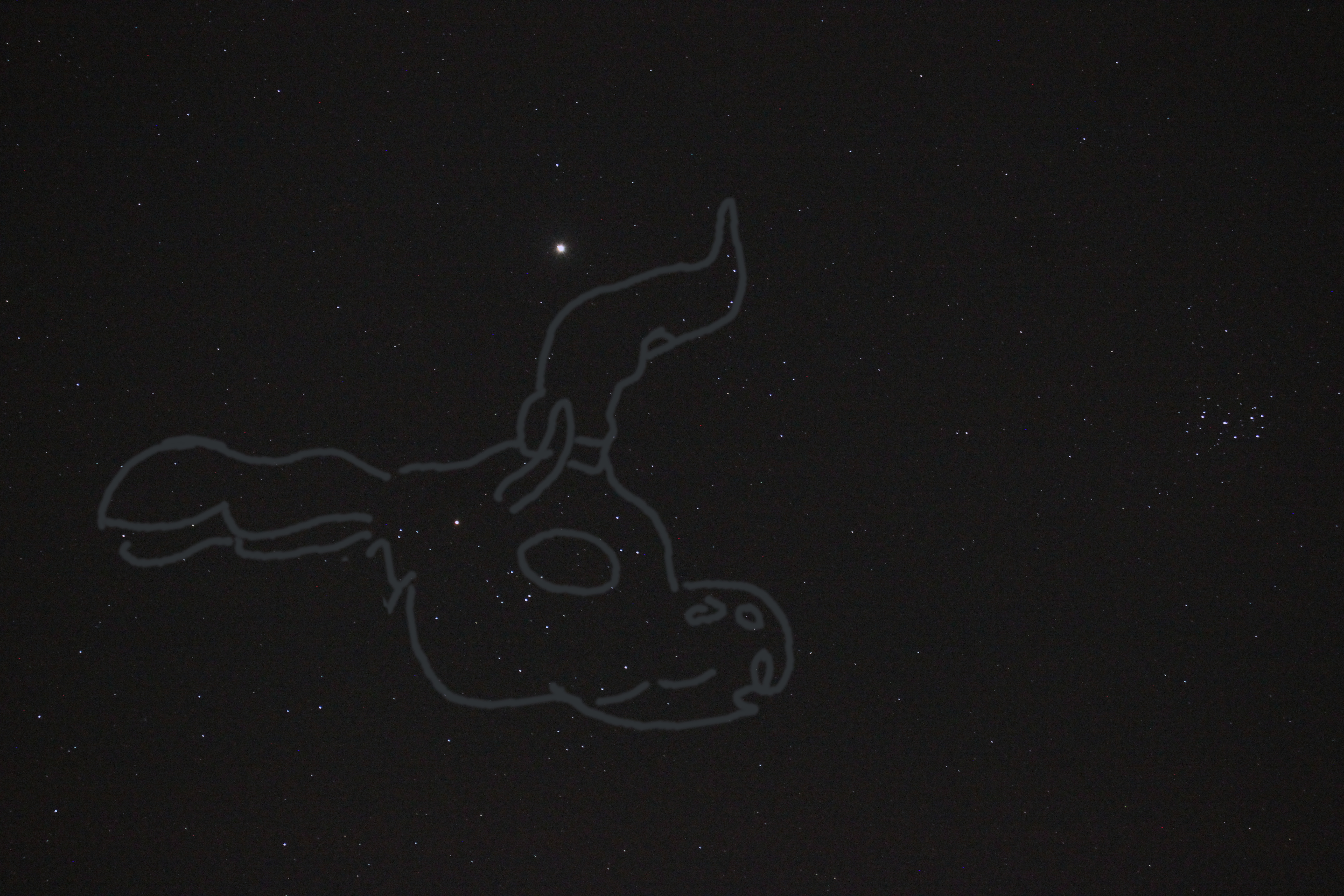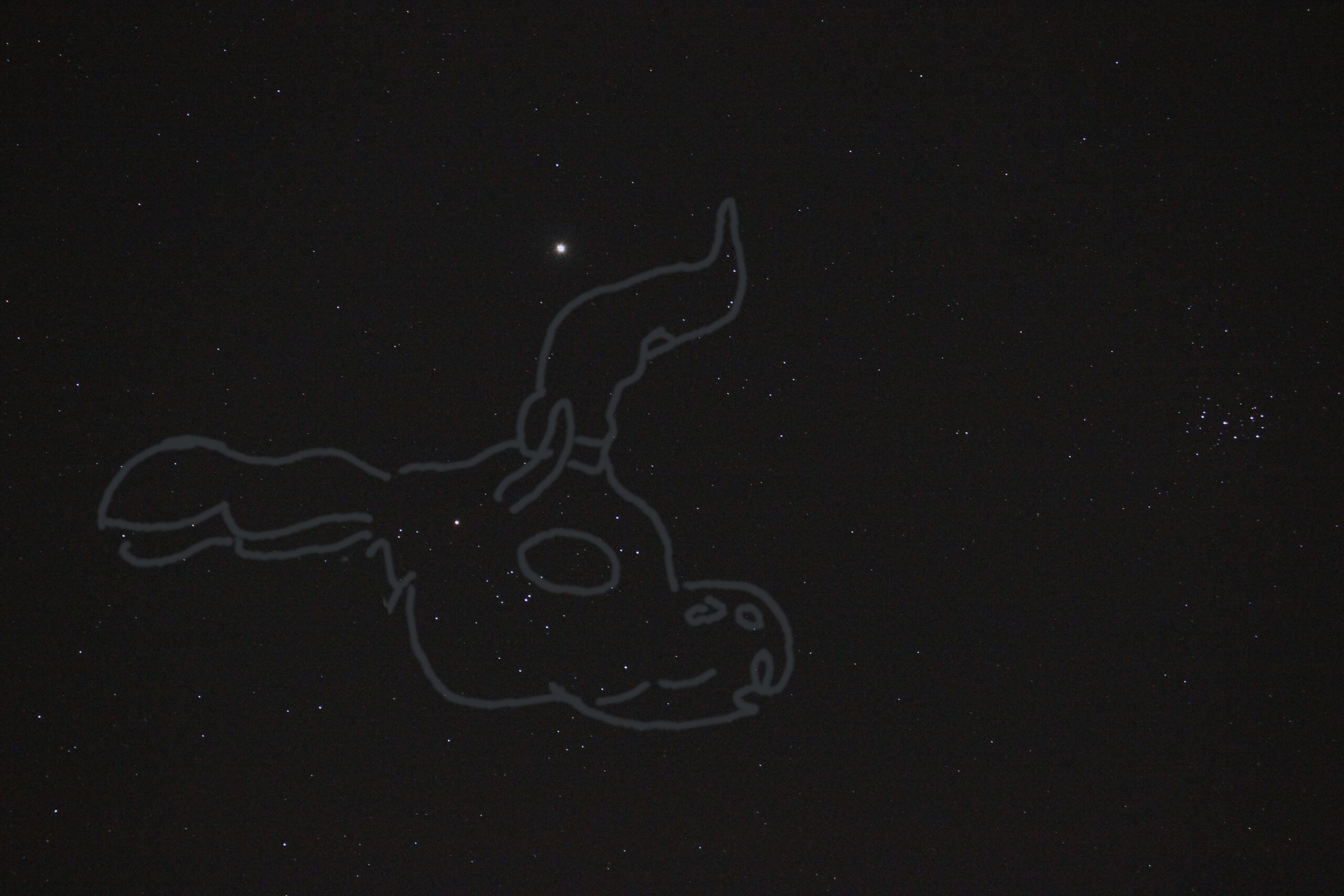 The Babylonian constellation "Jaw of the Bull", Sumerian DA, Akkadian is lê, typically identified with the Hyades. (Map: Susanne M Hoffmann 2025, with photography if the star cluster and Jupiter)