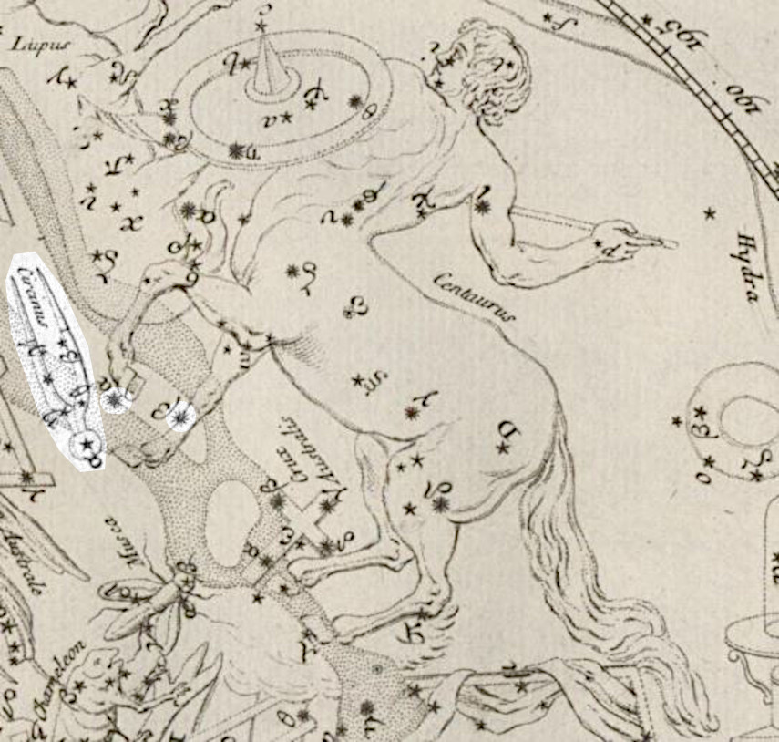 Constellation Le Compas (Circinus) in Lacaille's original definition. It is formed of faint stars neighbouring alpha Centauri (also highlighted here).