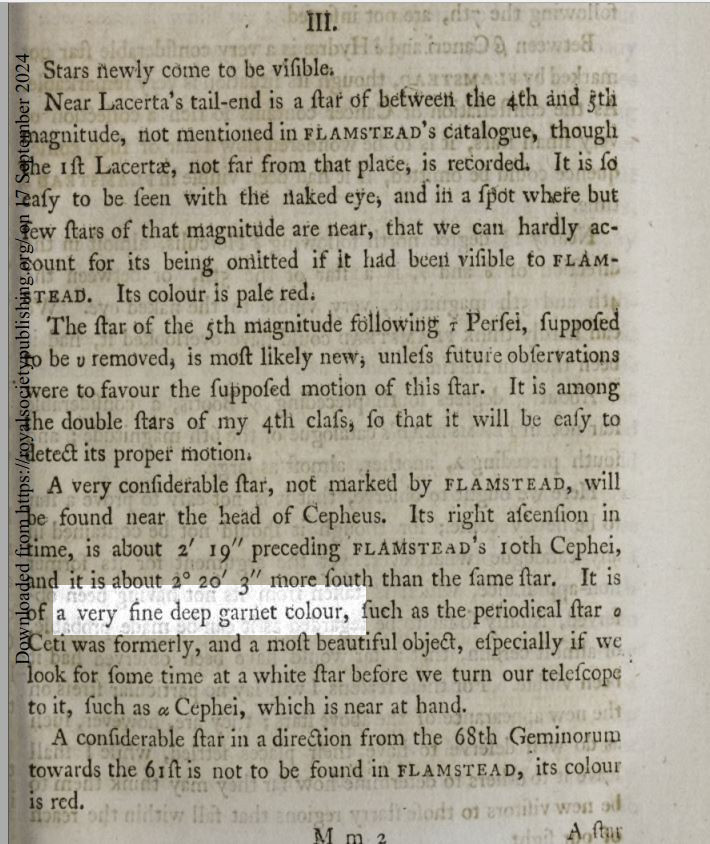 description of "fine deep garnet colour" in Herschel's manuscript