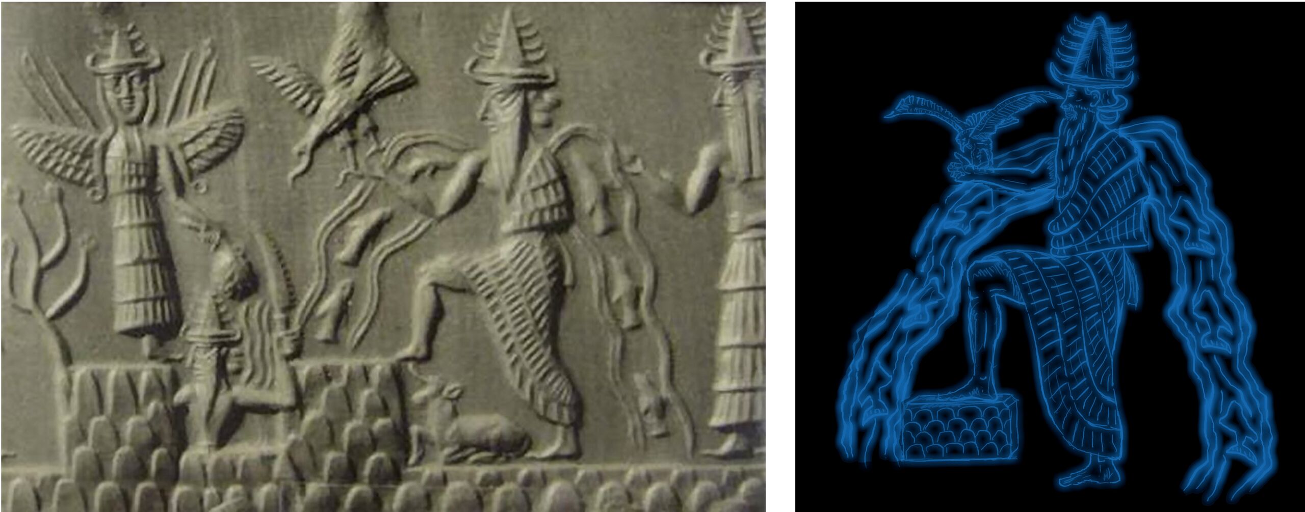 Ea, (a) depicted on the Adda Seal (dating 2300 BCE) and (b) repainted for planetarium use by R. Perdok (LWL Planetarium Münster, 2016).