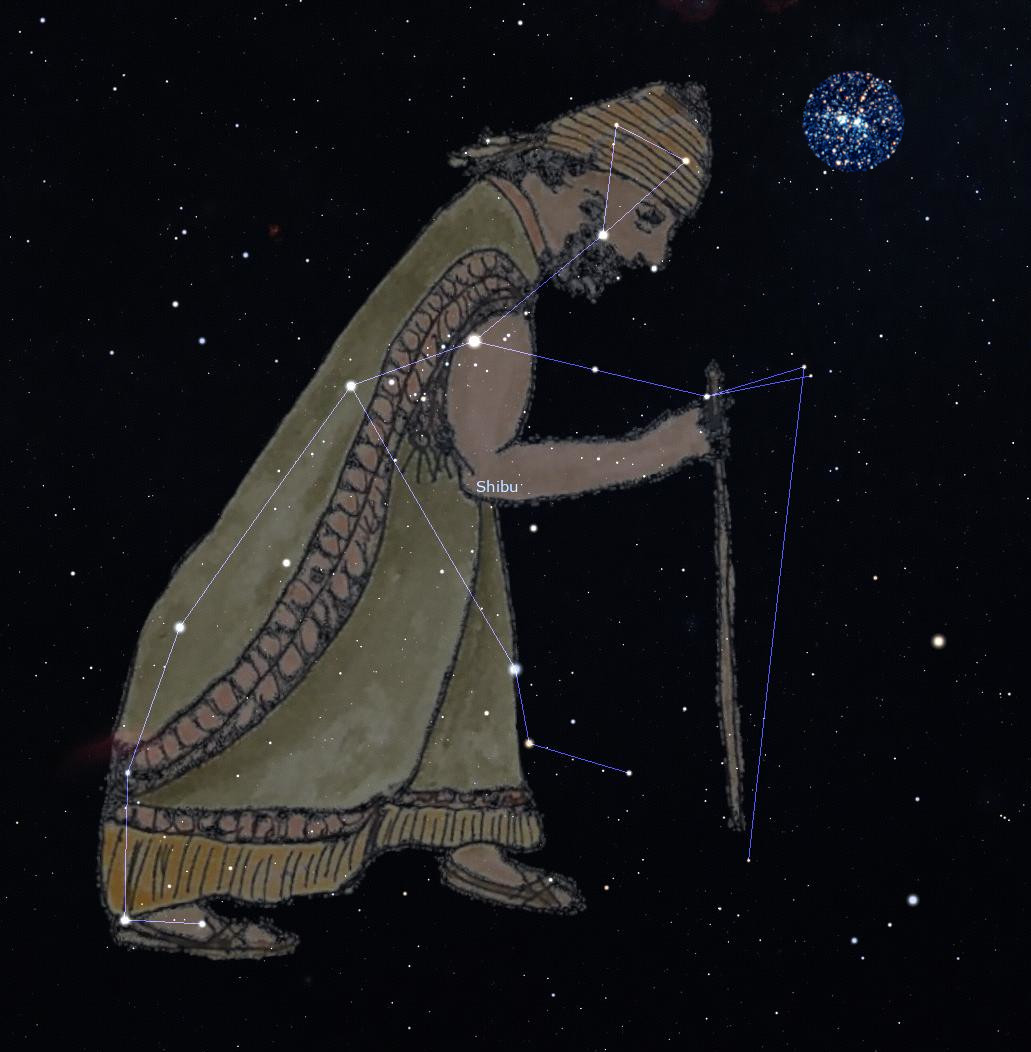 The Mesopotamian constellation of The Old Man, Enmesharra, with a photograph of the double star cluster h and chi Per. Painting by Jessica Gullberg, photograph and composition of the images by Susanne M Hoffmann (2025).