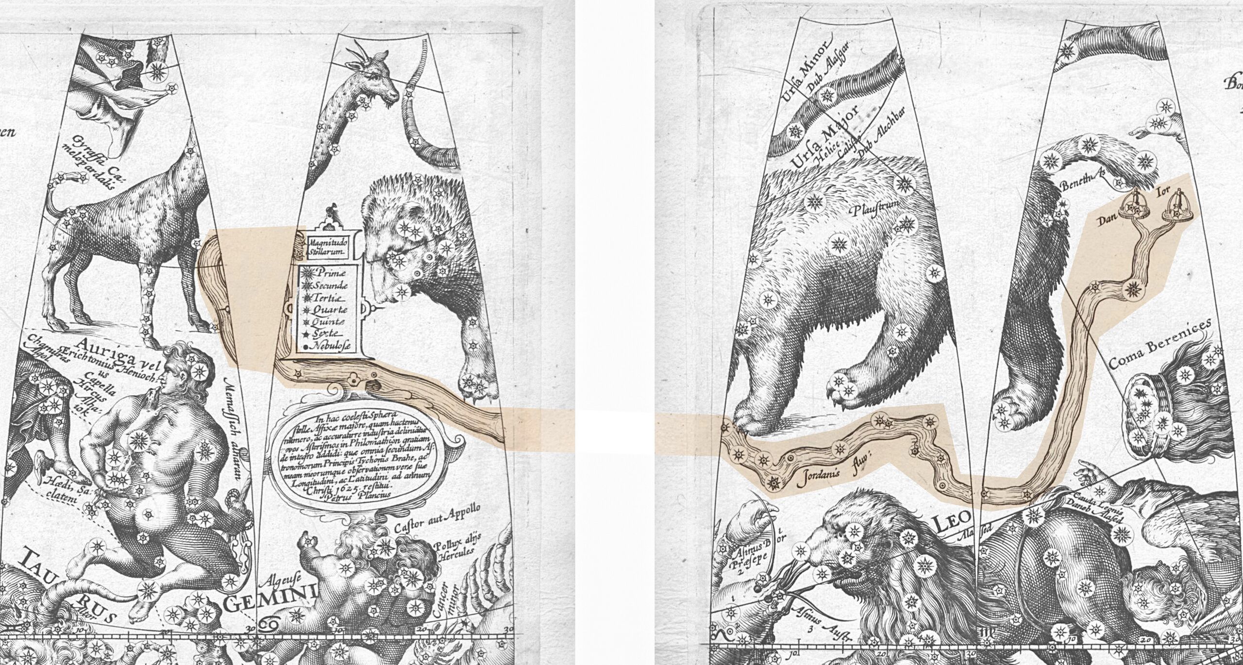 Globe gores of the 1612 celestial globe by van der Keere & Plancius on which Plancius introduced his last set of biblically inspired constellations, including Jordanus (highlighted). Note that the year 1625 mentioned in one of the cartouches is not the year of publication but the epoch for which the stellar coordinates were plotted.