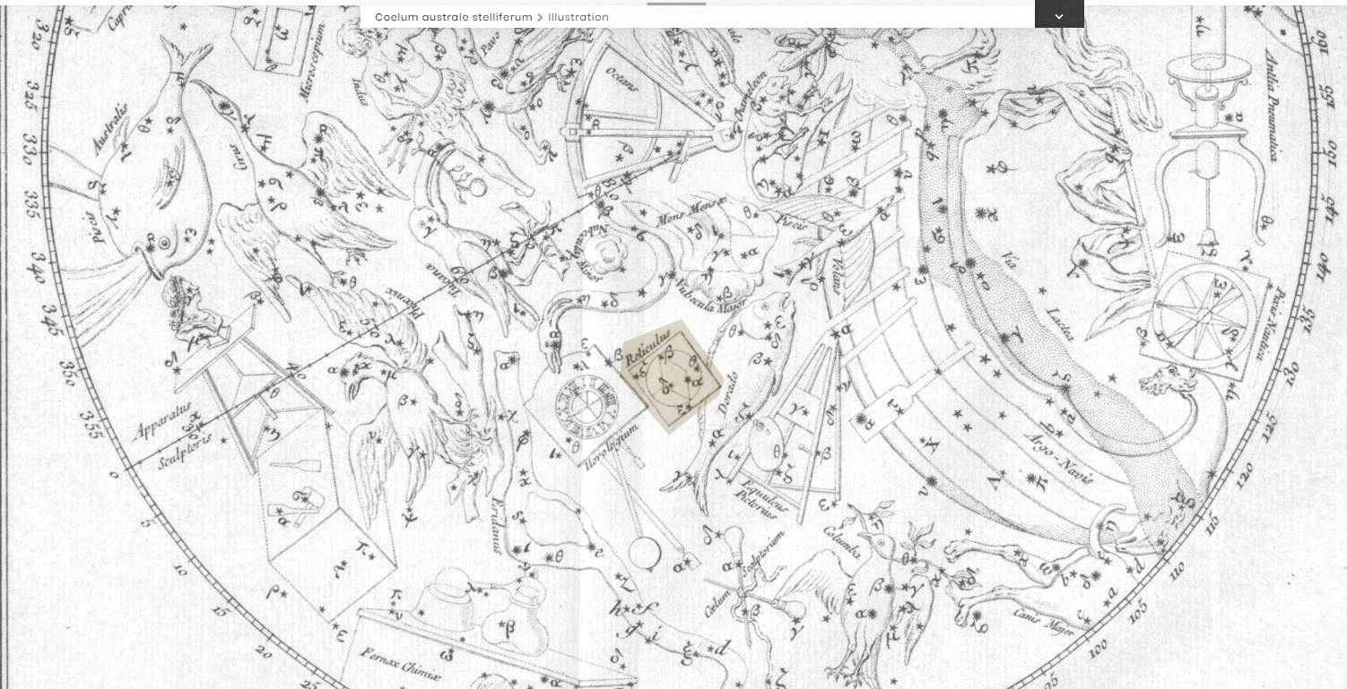 Lacaille's constellation Reticulum in its first publication (labelled Reticulus). https://www.e-rara.ch/zut/content/zoom/197200?lang=en&zoom=5&lat=1145&lon=3274&layers=B