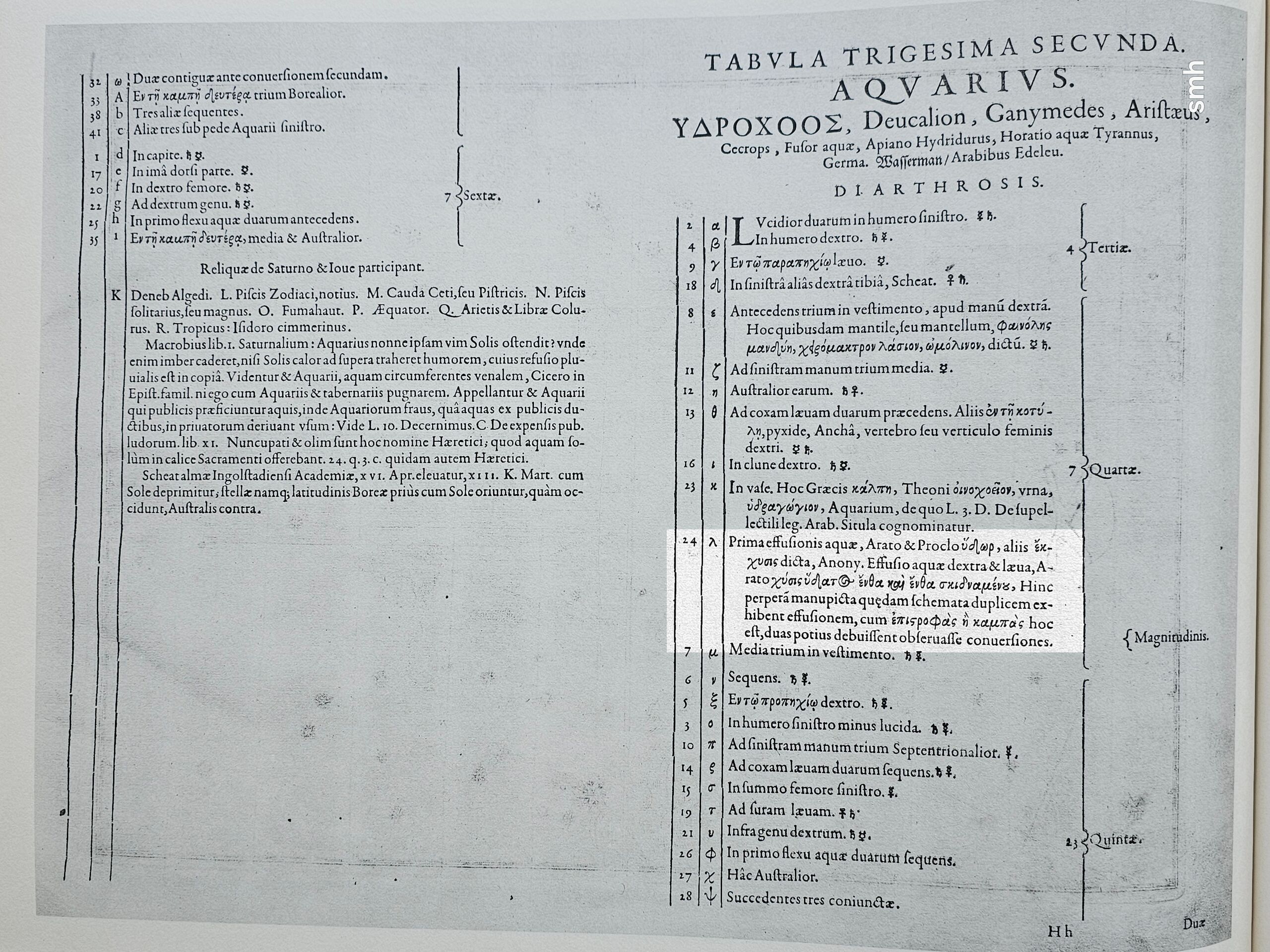 Bayer (1603) Aquarius star list with the star lambda (highlighted) described as occasionally named "Hydor" (Water) by historical authors.