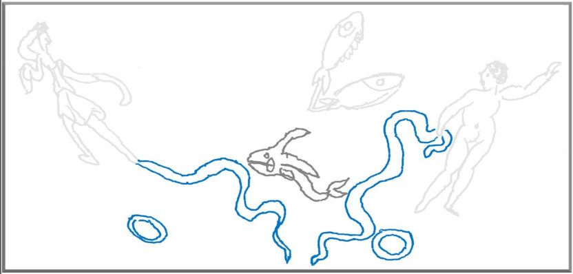 map of the Kugel Globe, Cetus in the center of two lines with rings, drawing by SMH 2024