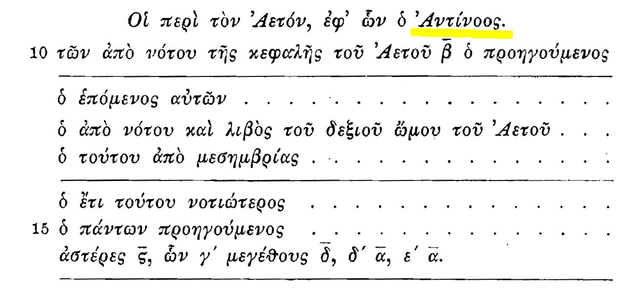 Antinous in the original ancient Greek version of the Almagest (written by Ptolemy of Alexandria 137 CE, printed edition by Heiberg 1898).
