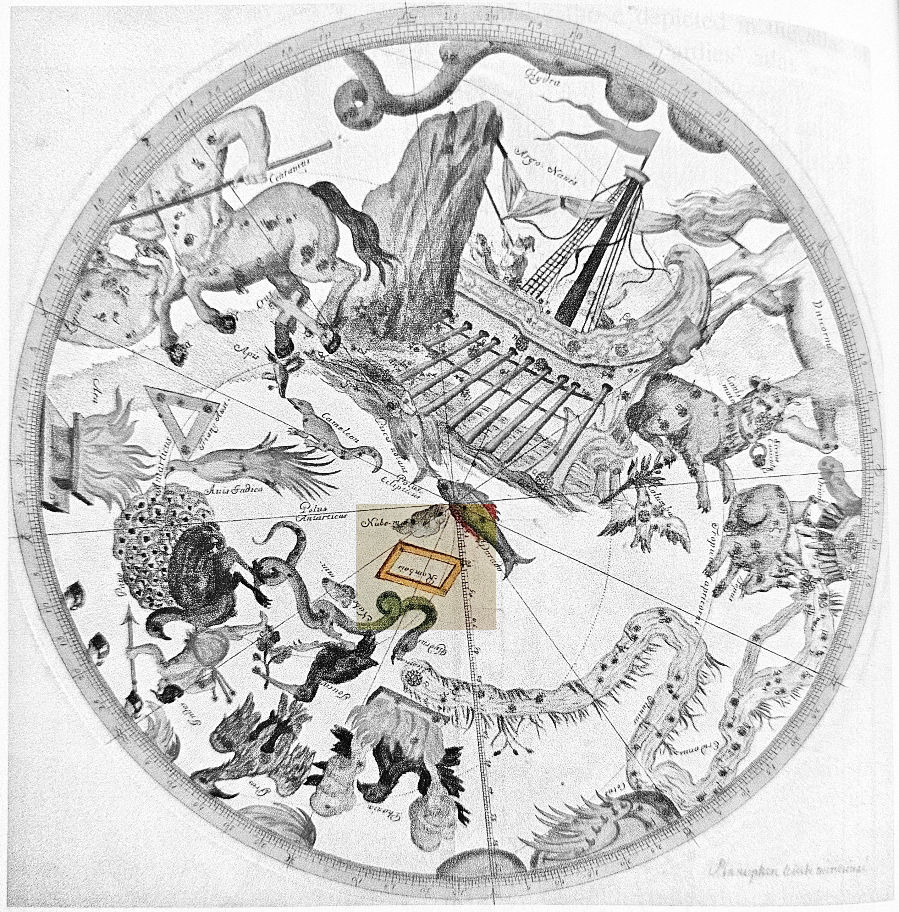 Royer (1679) southern sky, constellation "Rombois" (Rhombus) highlighted, (CC BY "IAU WGSN")