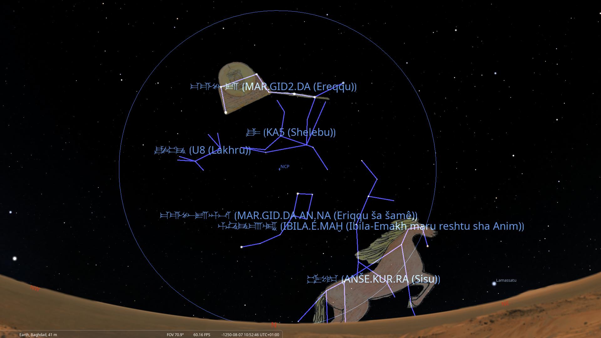 Babylonian constellations in the north are not well identified; this is a suggestion that the Heir might ride the (complete) Horse and, this way, be in the circumpolar area. Screenshot from Stellarium (2025).