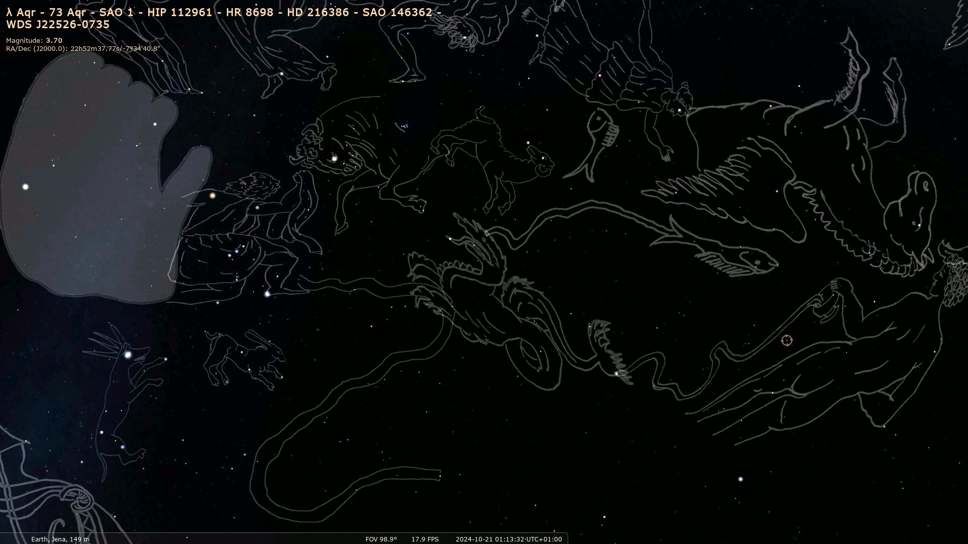 | current | 00:31, 21 October 2024 | 1,920 × 1,080 (911 KB) | Sushoff (talk | contribs) | The Stellarium sky culture "Farnese Globe" maps the depiction of the ancient marble globe to a modern star chart. The constellation of The River and the asterism of the (water)outlet of Aquarius form a huge watery environment for Cetus, The Seamonster. The northern edge of this area is bordered by the "ribbon" of Pisces of which only the southern part is drawn on the marble globe. The artist who made this globe apparently did not consider Pisces as two fish connected with a ribbon, but the no... |
