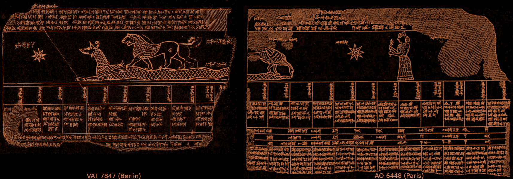 Leo and Virgo above the MUŠ-Dragon, two claytablet drawings from the Seleucid era (roughly 2nd century BCE), CC BY SMH based upon the drawings by E. Weidner (1967) and Thureau-Dangin (1922).