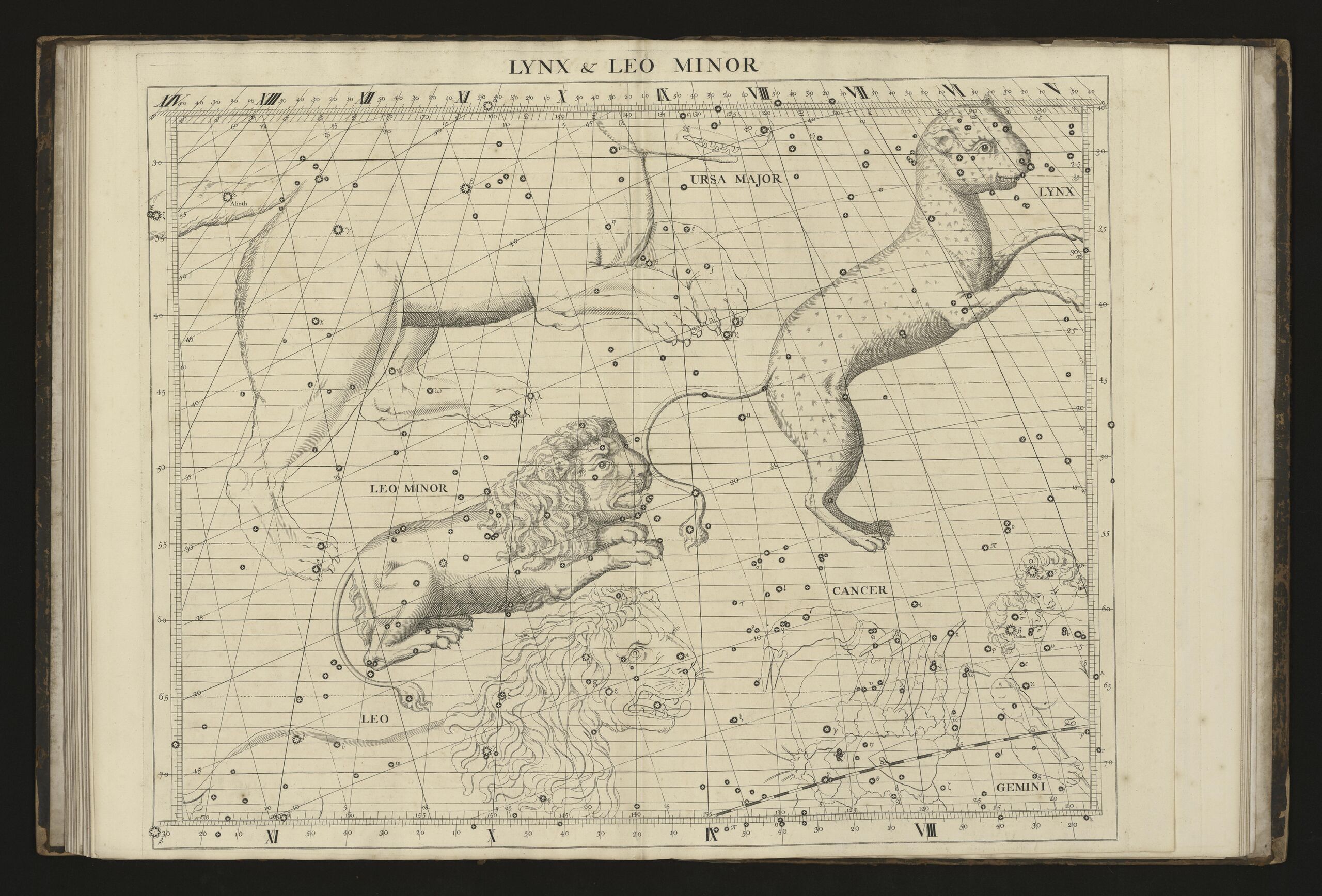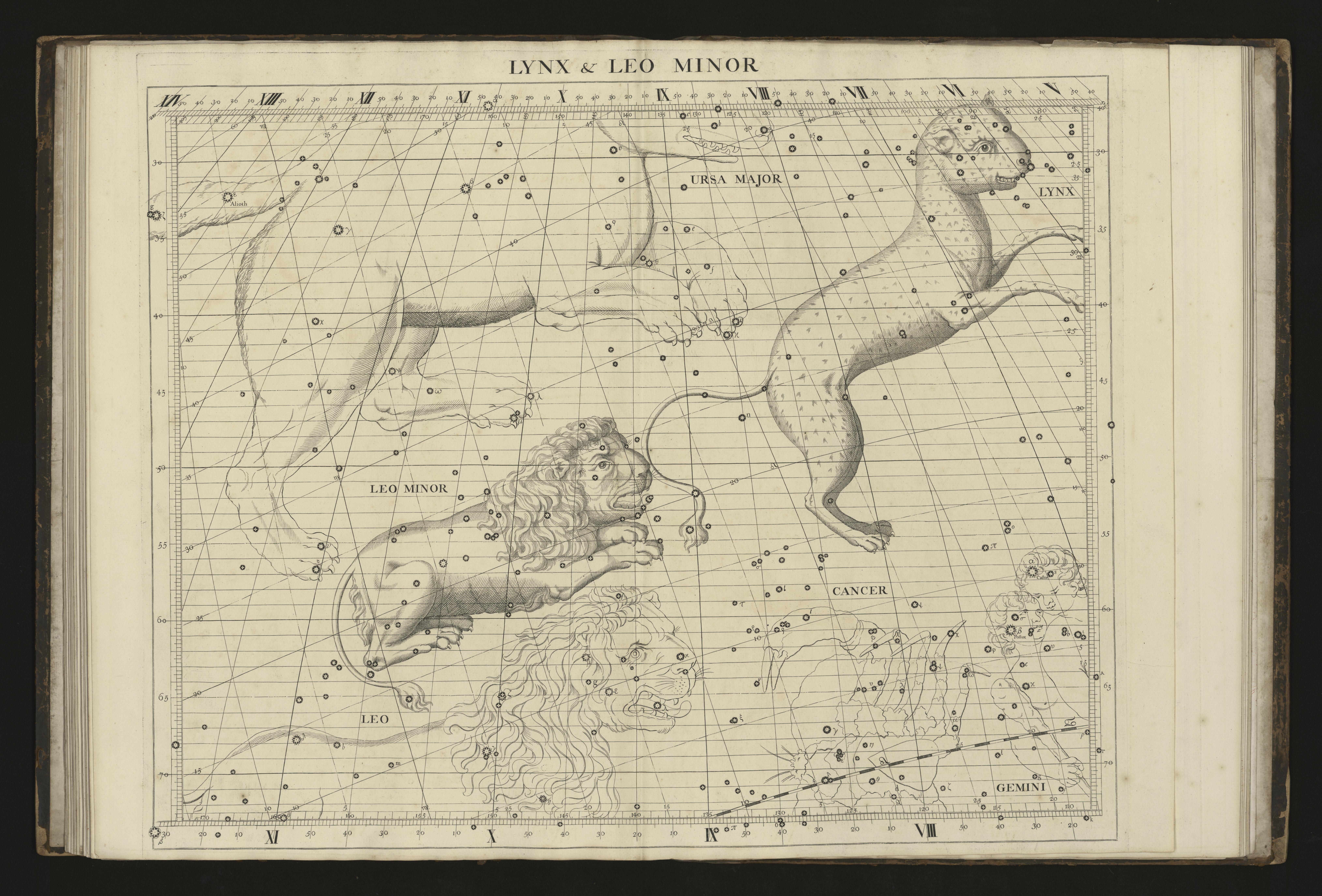 Flamsteed's 1729 depiction of the two cats, Leo Minor and Lynx, on the same page of his atlas.